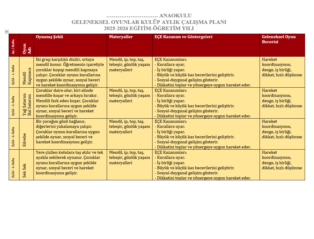 Ana Sınıfı (Okul Öncesi) Geleneksel Oyunlar Yıllık Kulüp Planı 2