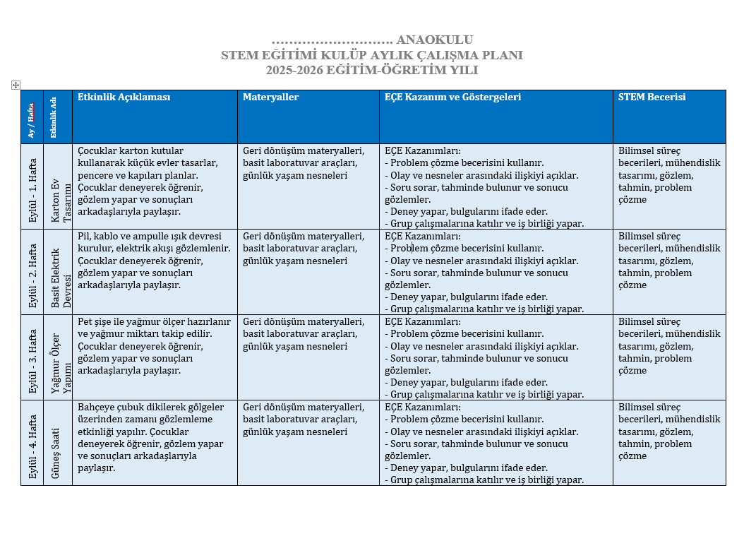 Okul Öncesi STEM ÇOCUK KULÜBÜ YILLIK PLANI