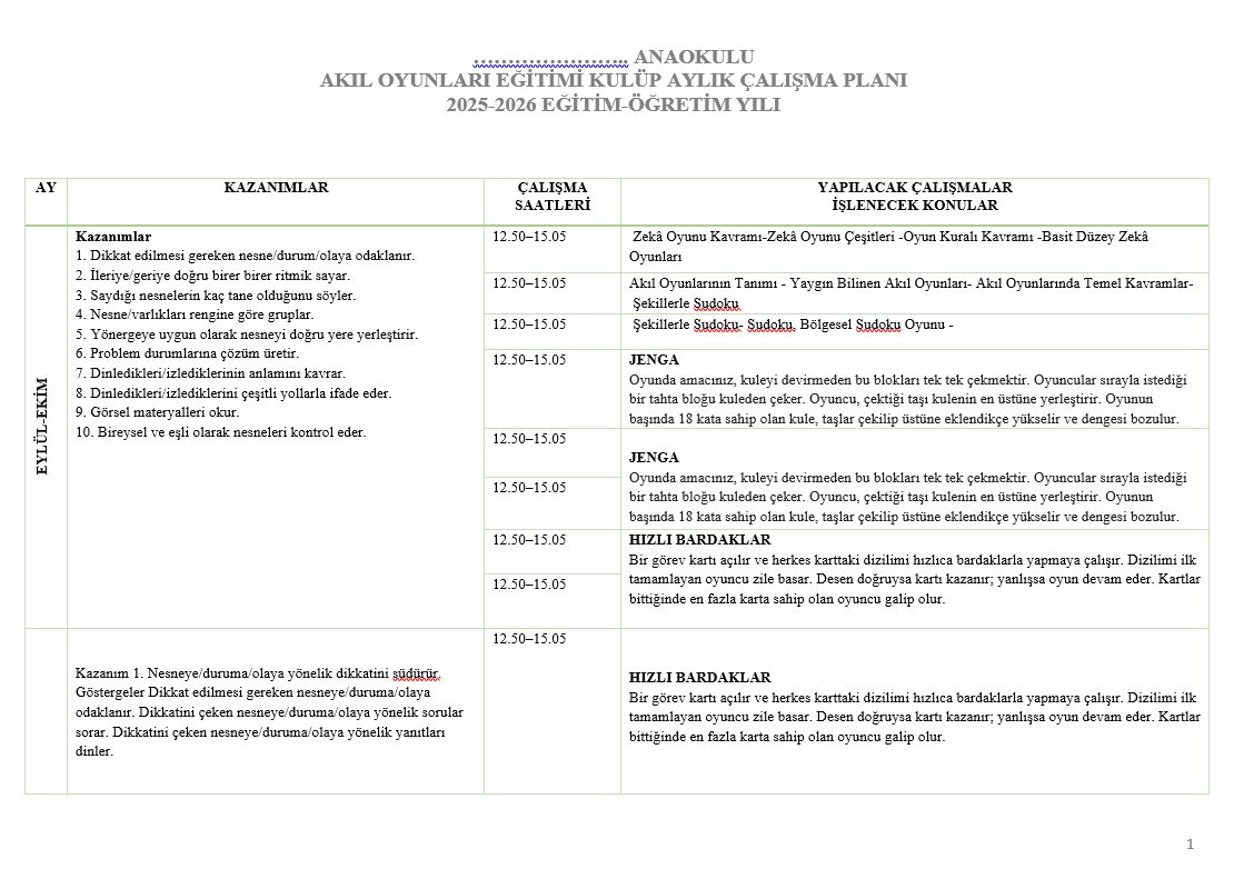 Ana Sınıfı (Okul Öncesi) Akıl Zeka Oyunları Kulüp Yıllık Planı