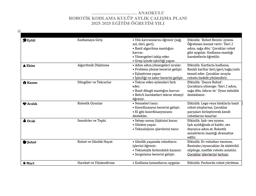 Ana Sınıfı (Okul Öncesi) Robotik Kodlama Kulüp Yıllık Planı