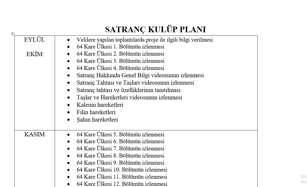 Ana Sınıfı (Okul Öncesi) Satranç Kulüp Yıllık Planı